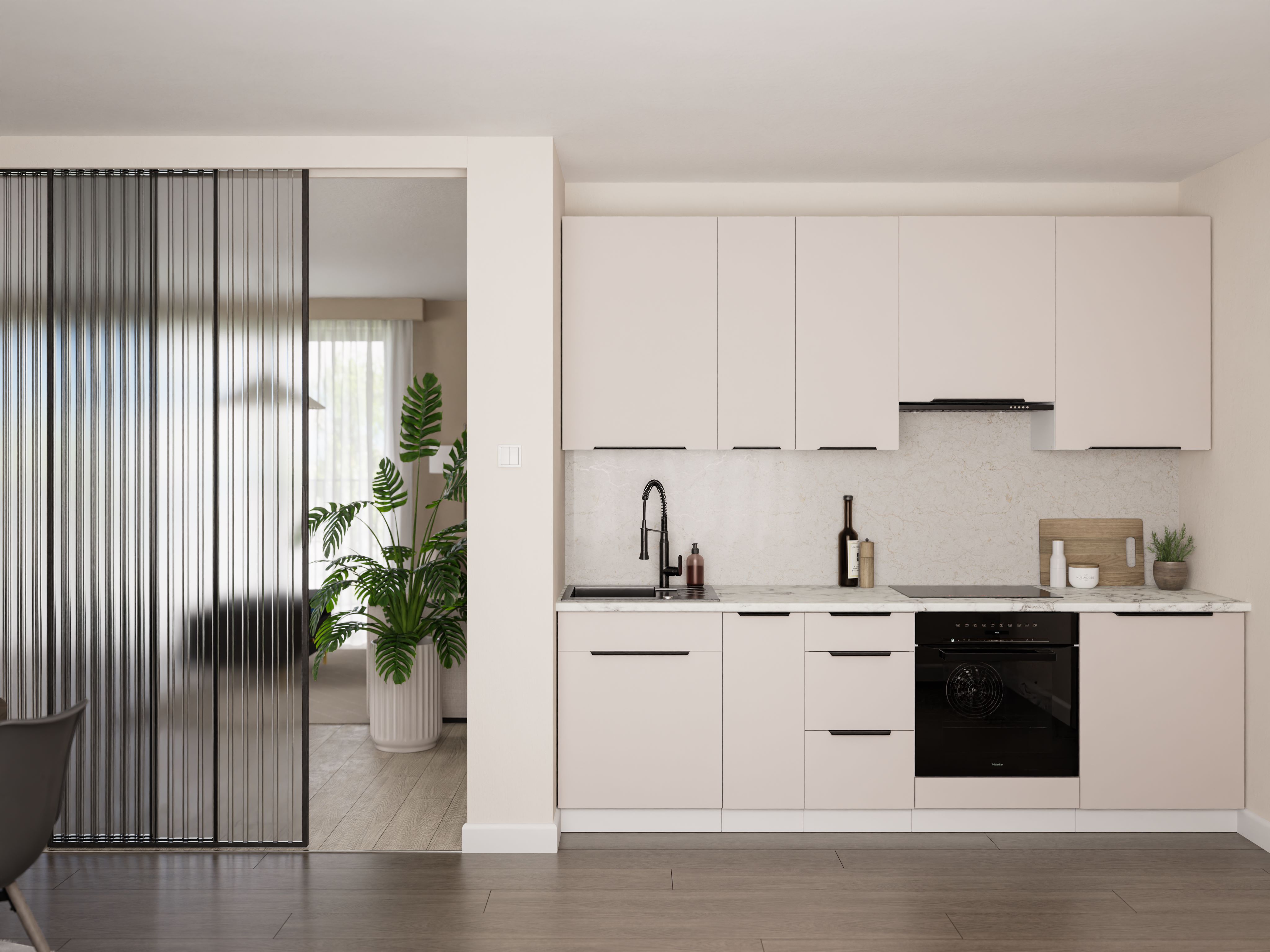 A Niki 43 konyha a kasmírszínű frontok harmonikus kombinációja a tiszta fehér korpusszal és egy kifinomult, modern formavilággal. A világos korpusz könnyedséget és frissességet kölcsönöz a térnek, kiemelve a beépítés minimalista jellegét. Ez egy olyan ajánlat, amely azoknak szól, akik értékelik az eleganciát modern köntösben, valamint a fényben, rendben és időtálló stílusban gazdag tereket.