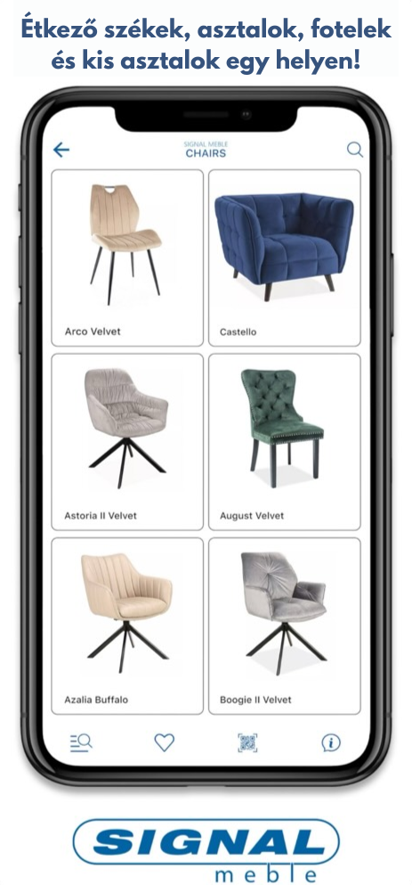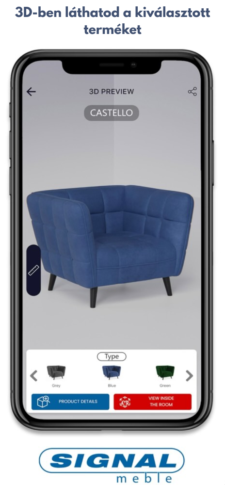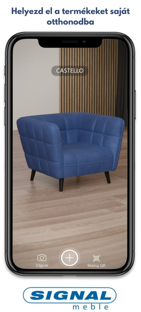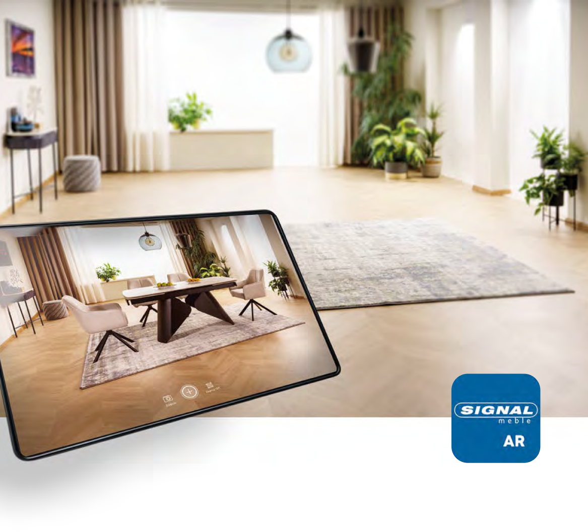 A ‘SIGNAL bútor belsőépítészeti’ alkalmazásban használt Kiterjesztett Valóság technológiának köszönhetően önállóan is valósághű bútorvizualizációt készíthetsz telefonodon vagy táblagépeden a kollekciónk darabjairól.